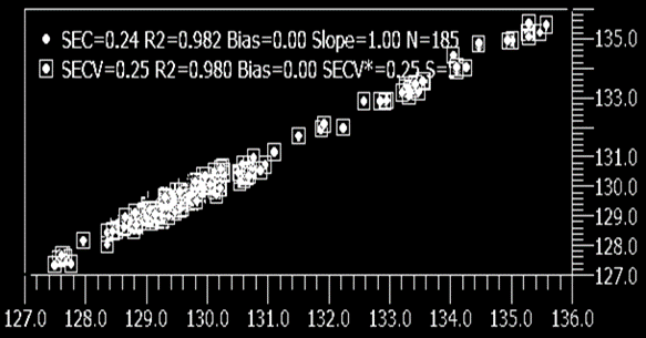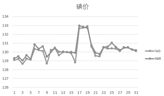 從圖中可看出碘價定標模型的化學值和預測值有很好的相關性,驗證集相關系數達 R2 到 0.982,驗證集偏差 SECV 為 0.25,模型具有較高的穩定性和預測能力,預測效果如圖 3 所示。