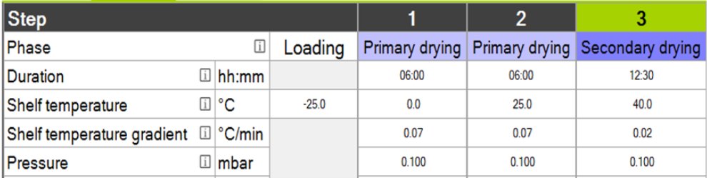 經(jīng)過一夜深度冷凍后,冷凍的吉洛伊莖連同托盤和擱板一同被轉(zhuǎn)移到 Lyovapor?L-200 凍干機(jī)中,冷凍干燥參數(shù)如下表所示。