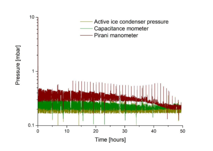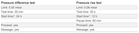 壓力差測試設(shè)置極限壓力為 0.050mbar,測試時間 30 分鐘。該試驗在冷凍干燥過程開始時直接開始。對于壓力升高測試,壓力限制設(shè)置為 0.060mbar,測試時間 30 秒。第一次升壓試驗在冷凍干燥開始 12 小時后進(jìn)行,每 60 分鐘重復(fù)一次。