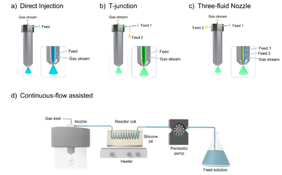 解決方案:這個問題可以通過使用T型接頭或三流體噴嘴(圖2)來解決,這些附件可以縮短前驅體溶液之間的接觸時間。