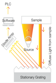 鎢鹵素燈不斷發光,照射樣品。樣品的漫反射光射向色散元件 (固定光柵),產生的空間分布單色光通過二極管陣列 (通常由 256 個二極管組成) 進行檢測。每個二極管根據其空間位置收集特定波長范圍的光強。這些獨立的二極管信號通常被稱為像元。測得的光強 (I) 與白色參考光譜 (I0) 比值,以及由像元對應的波長范圍,就構成所謂光譜,即 I/I0與 nm 或 cm-1 的關系圖。化學計量軟件根據相應模型從測量光譜中分析樣品的分子性質。