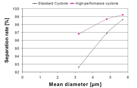 噴霧干燥過程的分離性能主要是通過測量所收集粉體的質(zhì)量,并與初始重量的比值來確定的。這僅僅反映了整個過程,并沒有量化旋風(fēng)本身的分離能力。因此,沒有在旋風(fēng)中分離的粉末是通過深床聚酯纖維過濾器來測量的。將高效旋風(fēng)分離器與標(biāo)準(zhǔn)旋風(fēng)分離器進(jìn)行了比較,它們都涂有靜電涂層。將不同濃度的鹽溶液進(jìn)行噴霧干燥,得到不同的粒度分布,用激光衍射分析儀測量。當(dāng)濃度為 1% ~ 20% (w/w)時,平均直徑變化在 3.2 ~ 5.7 μm 之間。