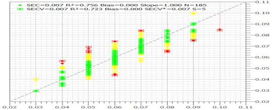 ▲ 酸價的化學(xué)值與預(yù)測值的相關(guān)關(guān)系圖