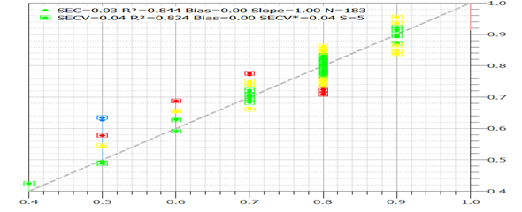 ▲ 色澤的化學(xué)值與預(yù)測值的相關(guān)關(guān)系圖