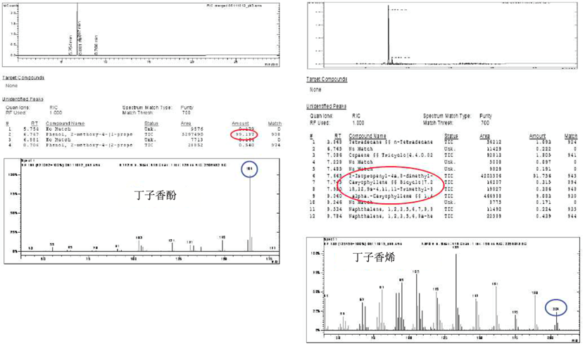 ▲ 圖2.采用 GC-MS 方式對(duì)分離得到的化合物1與化合物2進(jìn)行鑒定,發(fā)現(xiàn)為丁子香酚(MW:164)和丁子香烯(MW:204),純度超過99%