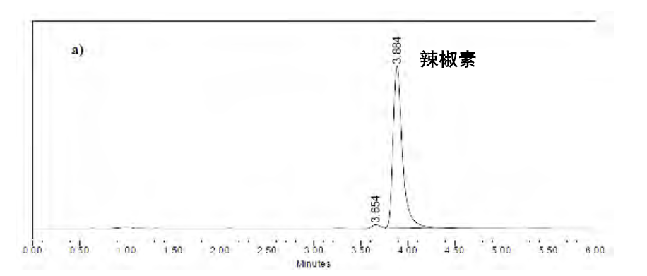 通過 HPLC 分離后,可以看到除了 3.882 min 的辣椒素,在 5.365 min 還有一個化合物,這是與辣椒素結構相似的二氫辣椒素。