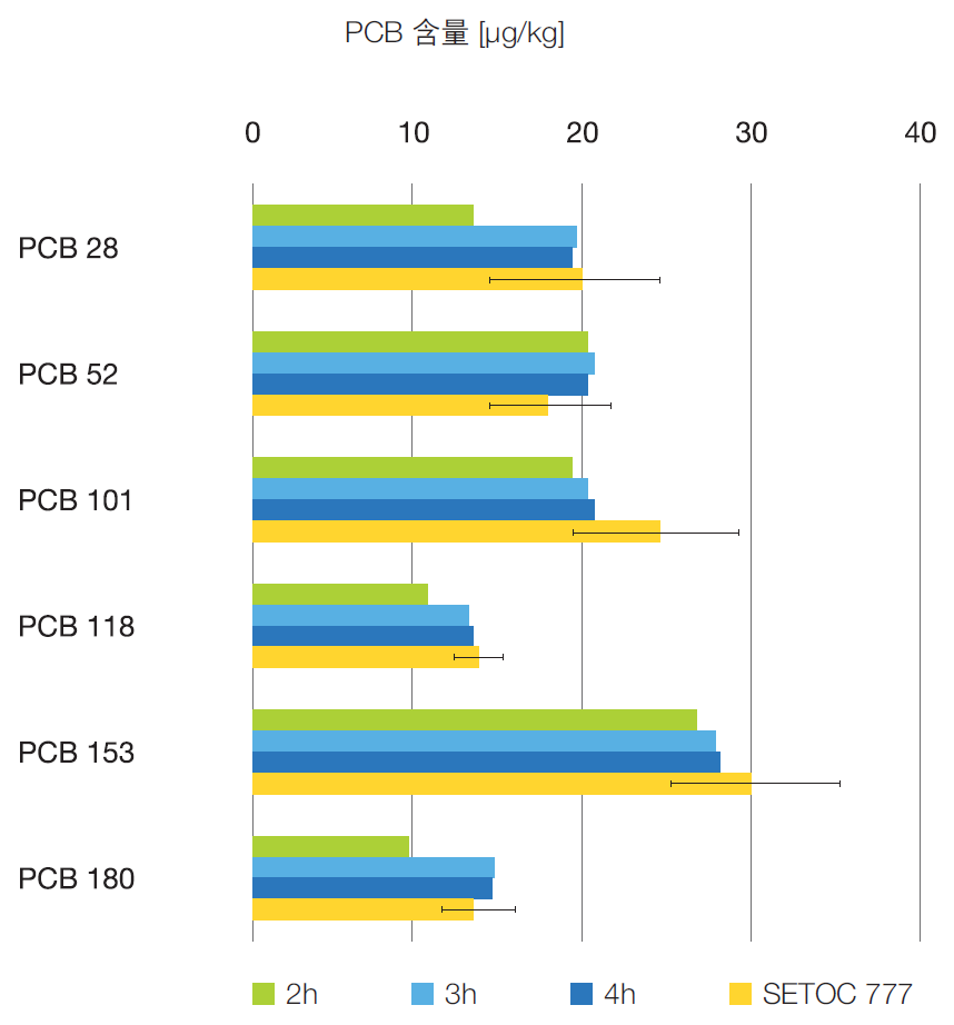 ▲ 圖5: 提取 2h、3h 和 4h 后 PCBs 的回收率,誤差條表示 SETOC 樣品測定值的可接受誤差范圍(+/-標準差).