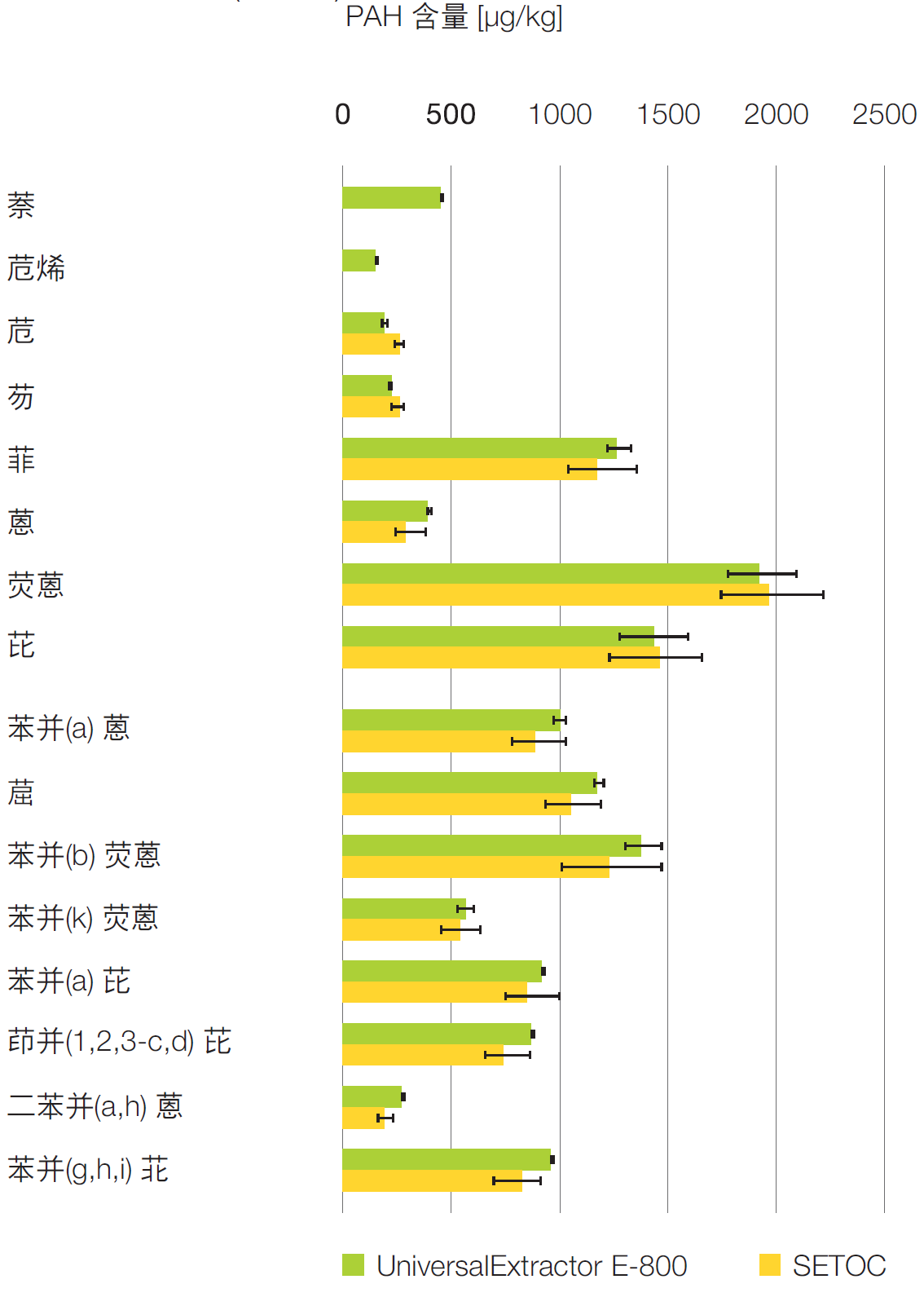 ▲ 圖6: 用全頻固液萃取儀 E-800 測定沉積物樣品中多環芳烴的含量。誤差條表示 SETOC 樣本的標準 s 值的可接受范圍(+/-標準差)