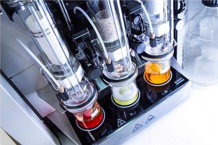 篩選大量預先選定的植物必然需要進行多次提取。迄今為止最常用的提取技術是冷浸或熱浸,索氏萃取設備被廣泛使用,而且產量更高,使用該系統也更經濟和環保的。為了優化萃取步驟,可以使用步琦全頻固液萃取儀 E-800(圖2)。該技術基于索氏原理,可以在完美控制的溫度條件下進行 6 次平行萃取,從而加速萃取步驟。該系統的各種特點是可以使用具有廣泛極性的溶劑,并且通過調整液位傳感器的高度,可以根據要工作的萃取物的體積輕松調整萃取腔體的體積。由于該系統是由玻璃制成的,因此可以直觀地跟蹤提取過程(圖3),這有利于提取后的清潔階段。加熱功率控制的精度,以及系統達到這個設定點的速度,使得溫度控制非常嚴格。