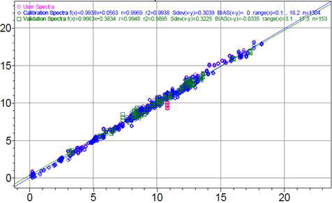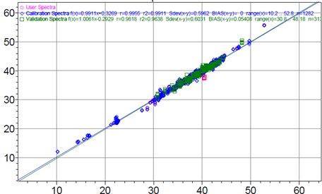 隨機選取酸奶樣品并掃描樣品,得到樣品近紅外吸收光譜,并建立相關理化指標的定標模型其中脂肪,蛋白質,干物質,脂肪,蛋白質的實際測量值和預測值具有較高的相關性,相關系數 R2 都達到 0.95 以上,三個指標的偏差值 SEC 分別為 0.59,0.30,0.11。
