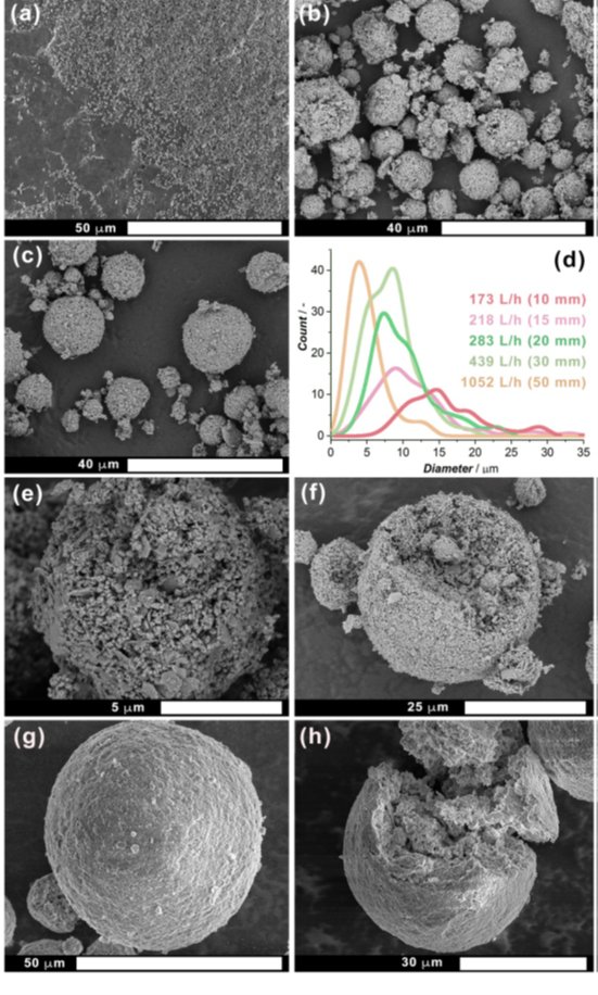 ▲ 圖1所示。(a)漿料的掃描電鏡圖像,漿料中高嶺土含量為 34%,ZSM-5 含量為 40%,Pural SB 含量為 26%;不同氣流(b) 173 L·h-1和(c) 283 L·h-1霧化得到噴霧干燥顆粒。(d)旋風收集器中收集的固體產品的粒徑分布隨氣體流速的變化曲線。噴霧干燥條件:Tin= 200°C, 11 mL·min-1,抽氣機80%。不經過(e-f)和經過(g-h)球磨機預處理 30min 得到復合顆粒。