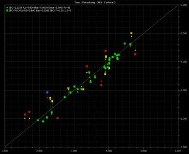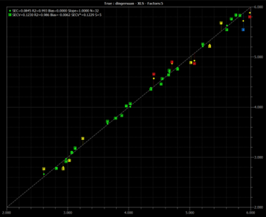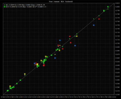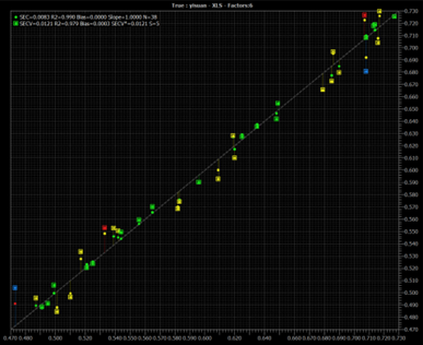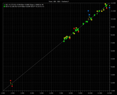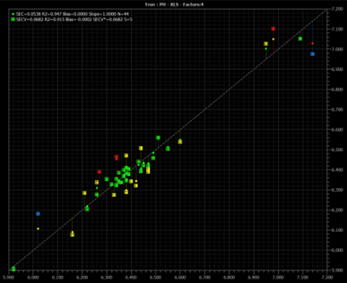 收集兩批生物發酵反應時樣品中的多種有機酸、葡萄糖、pH 及 OD 值含量,每批實驗在固定時間間隔取樣測量,結合取樣時的近紅外光譜建立相應模型,其化學值與近紅外預測值的分布圖如下: