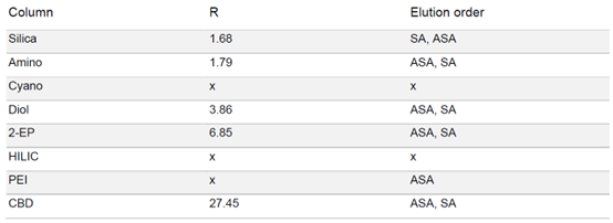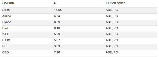 ▲ 表3:樣品在不同固定相色譜柱條件下的分辨率值和洗脫順序。