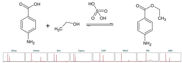 ▲ 圖3:頂部:苯佐卡因合成反應方程式,底部:Sepmatix 8x SFC儀器色譜柱篩選結果;從左到右:硅膠,氨基,二醇基,氰基,2-EP,HILIC,PEI和CBD;運行時間 = 15分鐘。