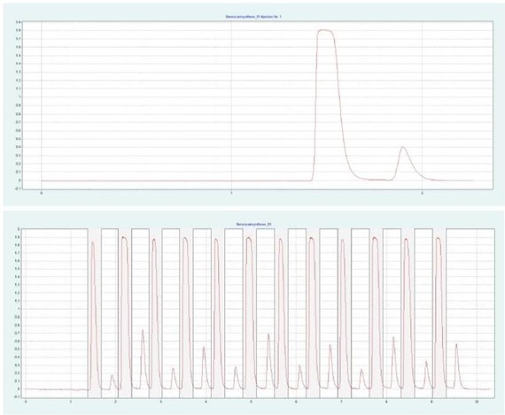 ▲ 圖 4:苯佐卡因的單次注射(頂部)和堆疊注射(底部)純化;運行條件:流速 = 20 mL/min, 改性劑 = 甲醇,改性劑 % = 28%,溫度 = 40 °C,壓力 BPR = 150 bar,注射量 = 90 μL,UV 波長 =276nm;堆疊注射條件:注射次數 =12,堆疊時間 =0.66min,餾分 =1(基于時間的)。