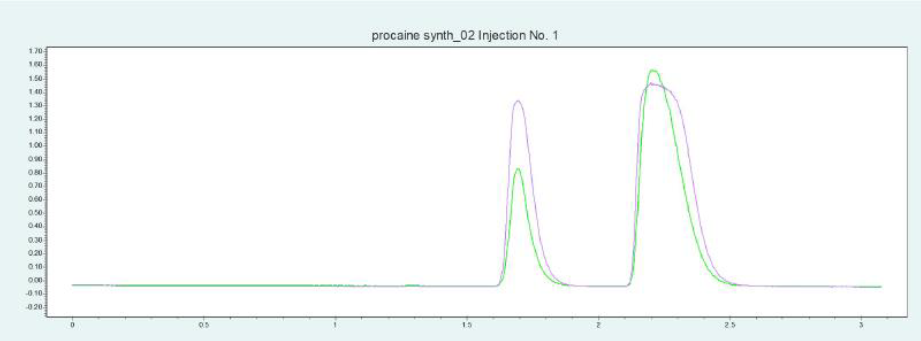 由于普魯卡因的基本特性,在部分色譜柱上的峰形非常不對稱。二醇基相下的峰前沿非常明顯,不對稱度系數為 0.58,而硅膠相下的拖尾非常明顯,不對稱度系數為 2.73。
