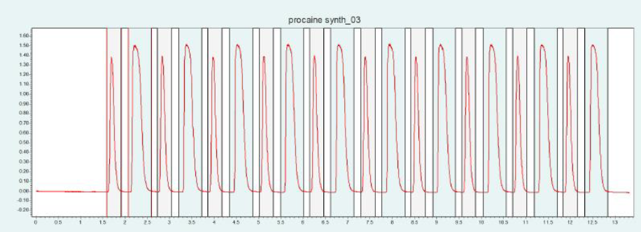▲ 圖 6:普魯卡因純化的單次進樣(上圖)和疊加進樣(下圖);運行條件:流速 = 20 mL/min,改性劑 = 甲醇/水(95/5 %)加 20 mM 氨水,改性劑 % = 25 %,溫度 = 40 °C,壓力 BPR = 150 bar,進樣量 = 100 μL,紫外波長 = 220 nm;疊加進樣條件:進樣次數 = 10,疊加時間 = 1.1min,餾分 = 2(基于時間)。
