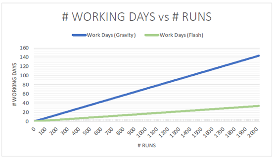 基于以上信息,重力色譜法和 Flash 色譜法的累積成本相等的點大約是 754 次。如果實驗室通常每天進行兩次重力純化,并使用 Flash 色譜法切換到每天兩次運行,則投資回報率將在 377 個工作日內達到。然而,如果實驗室每天進行更多的 5-10 次 Flash 純化,則盈虧平衡點將在 75 至 150 個工作日之間發生。