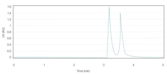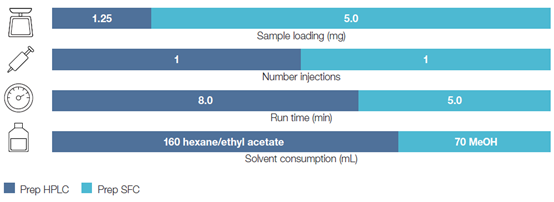 在利用超臨界制備色譜 SFC 純化分離酮洛芬時,所采用的流動相由 20% 甲醇與 80% 二氧化碳構成。SFC 在本次應用中具有明顯的優勢:流動相流速高達到 70 mL/min,運行時間只有 5 分鐘,而樣品分離度卻與 HPLC 相差無幾。利用SFC純化分離酮洛芬,速度方面相較于傳統制備型 HPLC 整整快了1.6倍之多,而且上樣量能夠達成4倍的顯著提升。在溶劑消耗方面,SFC 相較于 HPLC 更是減少了高達 55%,極大地節約了溶劑成本與后處理時間。