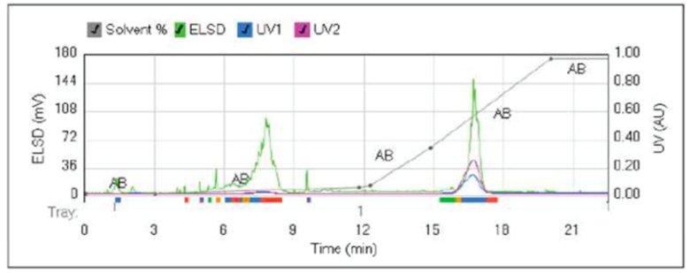 使用高靈敏度的 Pure Flash 色譜系統,對低含量植物萃取物中的重要成分進行分離和收集。在同一運行過程中,可以使用 UV 檢測器檢測發色團的峰和 ELSD 技術來檢測非發色團的峰,進行餾分收集和進一步分析。這樣可以純化天然產物提取物中的化合物和不容易用傳統 Flash 色譜系統檢測的低含量的有藥效的化合物。