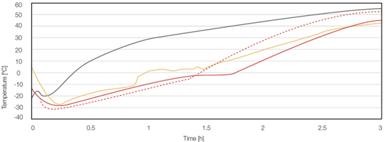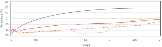▲ 圖3:陽光直射下冷凍干燥過程的溫度分布圖。黑線表示貨架溫度,紅線表示1% PVA(虛線)和5% PVA(實(shí)線)的干燥曲線,黃線表示5%海藻糖的干燥曲線