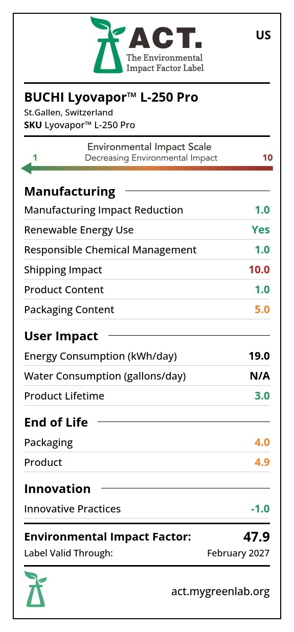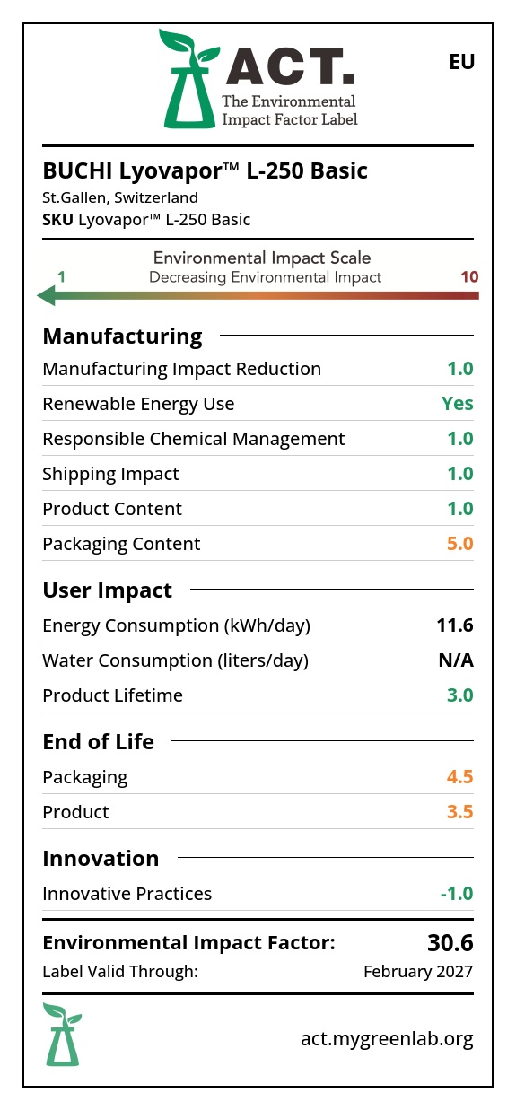 評估實驗室產(chǎn)品和儀器的可持續(xù)性需要獲得全面的環(huán)境影響數(shù)據(jù)。實驗室和采購經(jīng)理必須有足夠的信息來評估產(chǎn)品的可持續(xù)性。為了與持續(xù)改進和環(huán)境責任的承諾保持一致,BUCHI 加入了 ACT 標簽計劃,這是由非營利組織“我的綠色實驗室”發(fā)起的認證計劃。