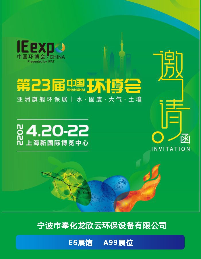 4月20-22日,一站式呈現環保全產業鏈解決方案,2022年第二十三屆上海環博會將在上海新國際博覽中心舉行,寧波市奉化龍欣云環保設備有限公司在E6展館A99展位等您!