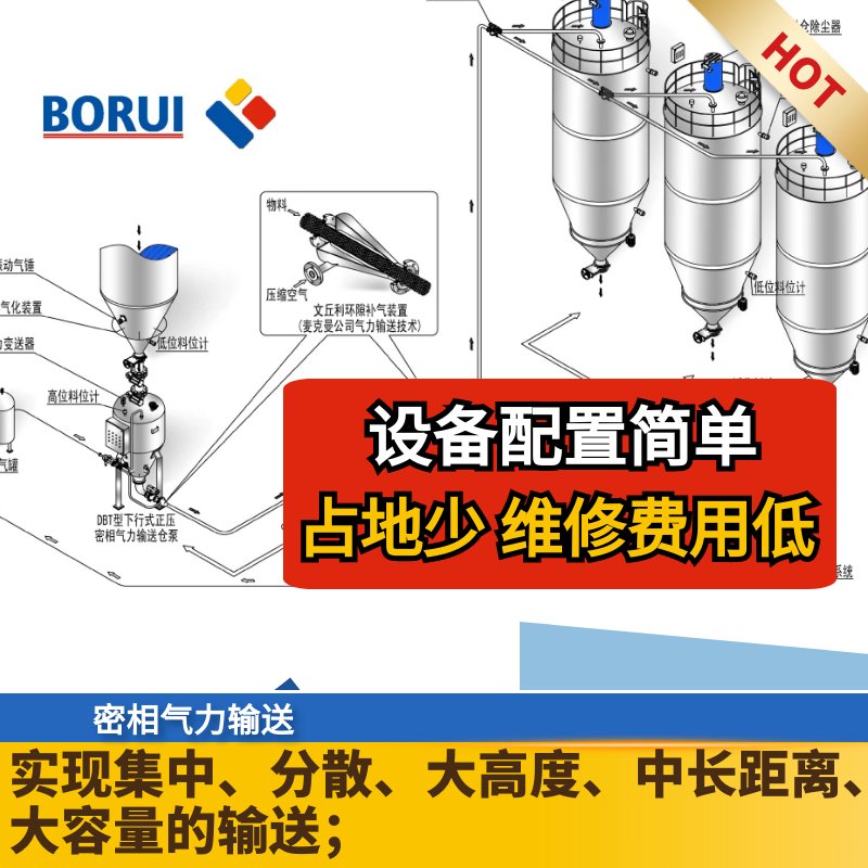 密相氣力輸送技術是通過沿管道形成一個壓差,利用空氣向壓力較低的區域移動來實現散裝物料的輸送。這個過程可以通過真空誘導器或將壓縮空氣注入管道的一端或沿著管道進行。使用少量的空氣將大量緊密相連的塊狀物料通過輸送線輸送,很像擠壓。稀相輸送系統通常使用大量的空氣以較高的速度輸送相對較少的懸浮物料,而密相輸送系統的優勢在于能夠以相對較低的速度有效地將密度較大的固體顆粒通過輸送線。