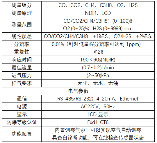 產品特性 1、防爆設計:儀表采用防爆設計,隔爆外殼使設備內部空間與周圍的環境隔開,確保發生爆炸時,外殼可承受產生的爆炸壓力而不被損壞,使火焰不能穿越隔爆間隙點燃外部爆炸性環境 2、測量準確度高:多組分測量氣體間無交叉干擾,測量準確度高。具備自診斷功能,可在線檢查傳感器狀態 3、工作性能穩定:傳感器采用雙通道設計,穩定性強;所有與樣氣接觸的部分均采用耐熱、耐腐蝕的特種不銹鋼、聚四氟乙烯等材料 4、自動化程度高:配置專業化預處理方案,高自動化,低維護,無需人工值守即可實現實時在線監測,大幅降低企業人工成本 5、數據管理簡捷:可通過多種接口傳輸到上級集中控制系統5、全量程氣體濃度測量,檢測范圍為(0.01-100)%,調整時間,也可以測量微量組分